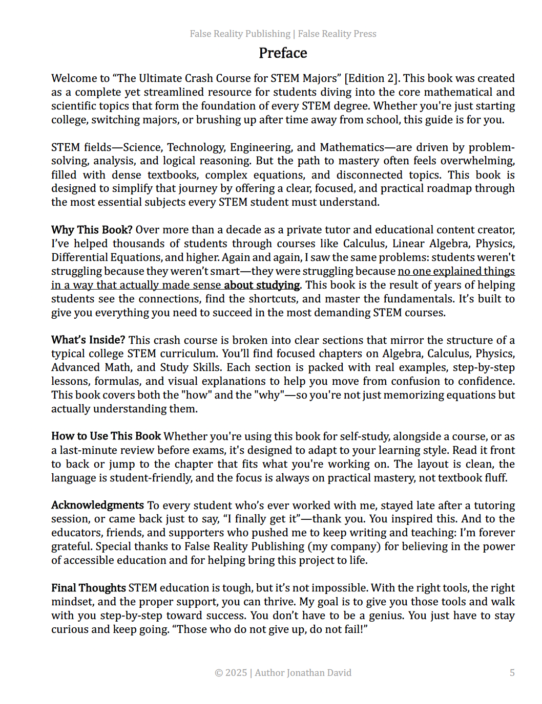 Preface False Reality Publishing | False Reality Press Welcome to “The Ultimate Crash Course for STEM Majors” [Edition 2]. This book was created as a complete yet streamlined resource for students diving into the core mathematical and scientific topics that form the foundation of every STEM degree. Whether you’re just […]